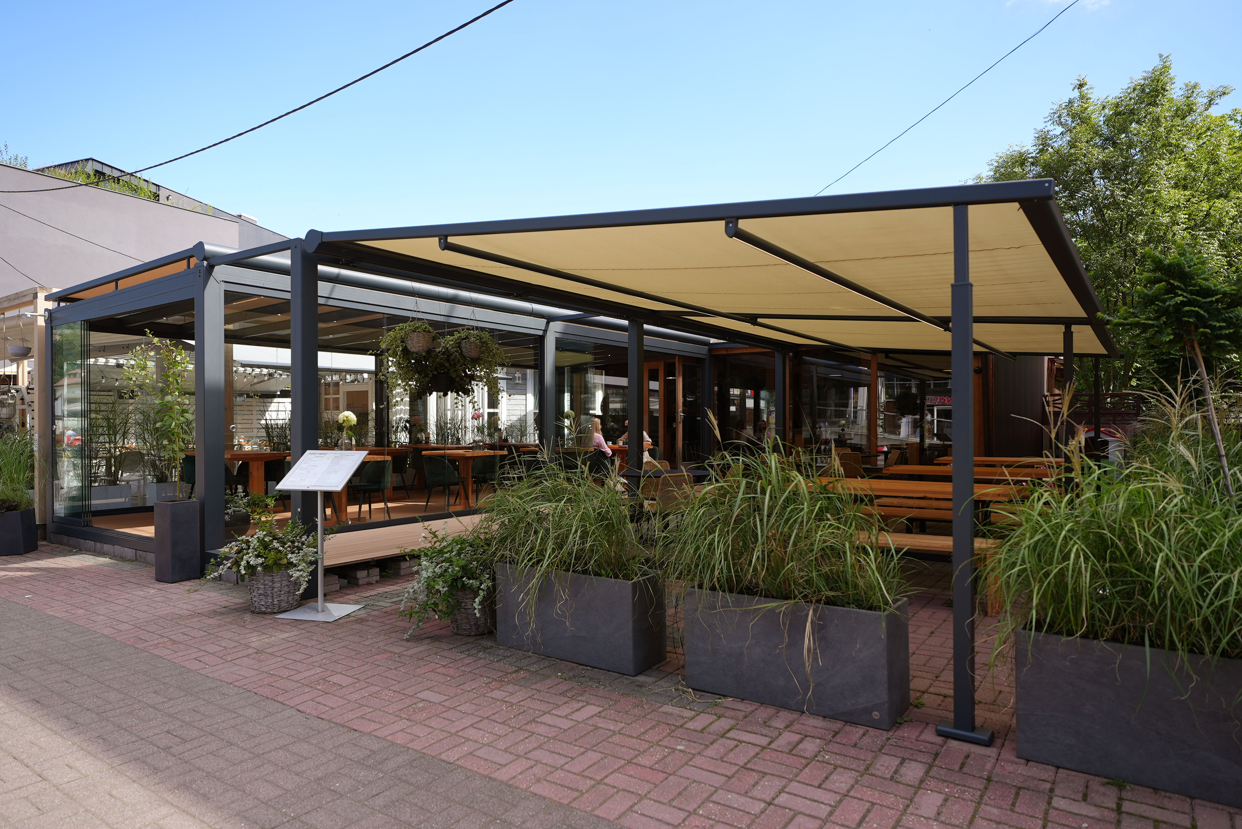 Powiększenie przestrzeni restauracji o dodatkową, ekskluzywną przestrzeń integralną z budynkiem, która służy do spędzania czasu na świeżym powietrzu niezależnie od pogody - to wszystko umożliwiają nasze realizacje.